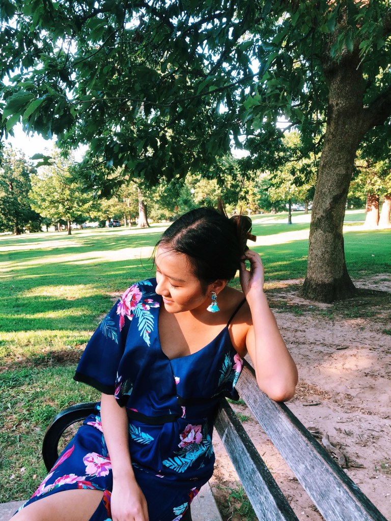 One of my favorite labels by an Asian designer, I loved how this kimono doubled as both a robe/cardigan and a dress of its own. The pink floral design is subtle and elegant, and lavender is one of my favorite colors so the accents were much appreciated! I paired with my pink crystal earrings for an outdoor picnic on the lawns, but have also worn it more casually with jeans, a nice lavender skirt, etc.