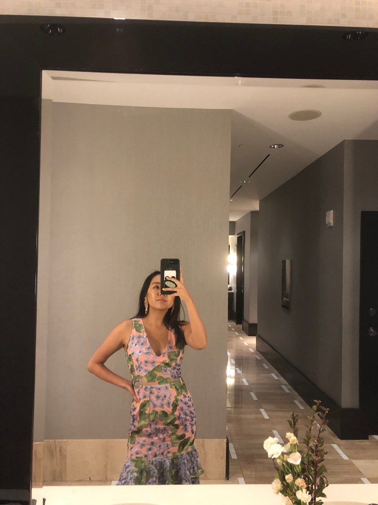 I’m glad I had a formal dinner to go to just so I could rent this dress. The asymmetrical ruffles on the bottom, detailed floral embroidery, flattering hourglass silhouette and beautiful colors (more pink and lavender for ya!) made this one of my favorite rental items so far. If only I had more events to wear it for!